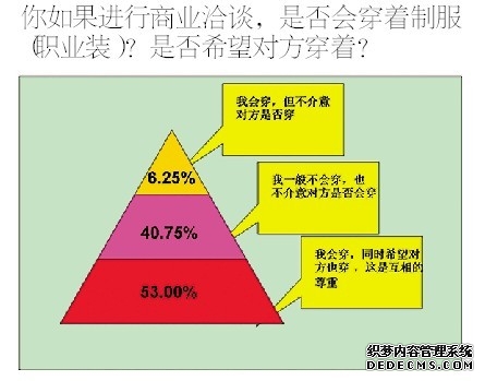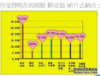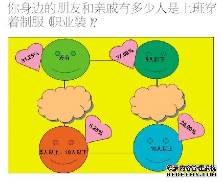 “款式太老套,应体现时尚元素;质量不透明,应找有品牌的生产企业制造;每个人应该有自己款式的制服(可以同色系);面料不透气,应运用新型面料;没有体现职业特色、企业文化;面料科技含量太低;颜色太暗淡,应有鲜艳颜色搭配......”调查结束后还有人在不断地补充建议,足见职业装在工作中有着重要的地位。