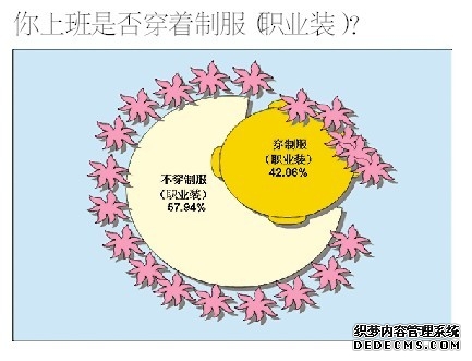 关于职业装的话题还有很多,在本报与第一纺织网的联合调查中足以见证职场人士对职业装时尚度颇有微词。无论是公司职员的西服,还是专业领域里的制服,都属于职业装的范畴,那么到底职业装在社会上占多大的比重?在本报对126位都市白领及专业领域人员的调查中发现,有53位受访者(占比42.06%)是上班时必须要穿着职业装(制服)的,他们大多数是外企、私企的对外沟通人员和航空、医院、银行、公交等系统的专职人员。而另外的73位受访者(占比57.94%)则表示上班不一定或者不会穿职业装(制服),他们通常为媒体、外私企的科研人员及私营商业者。
